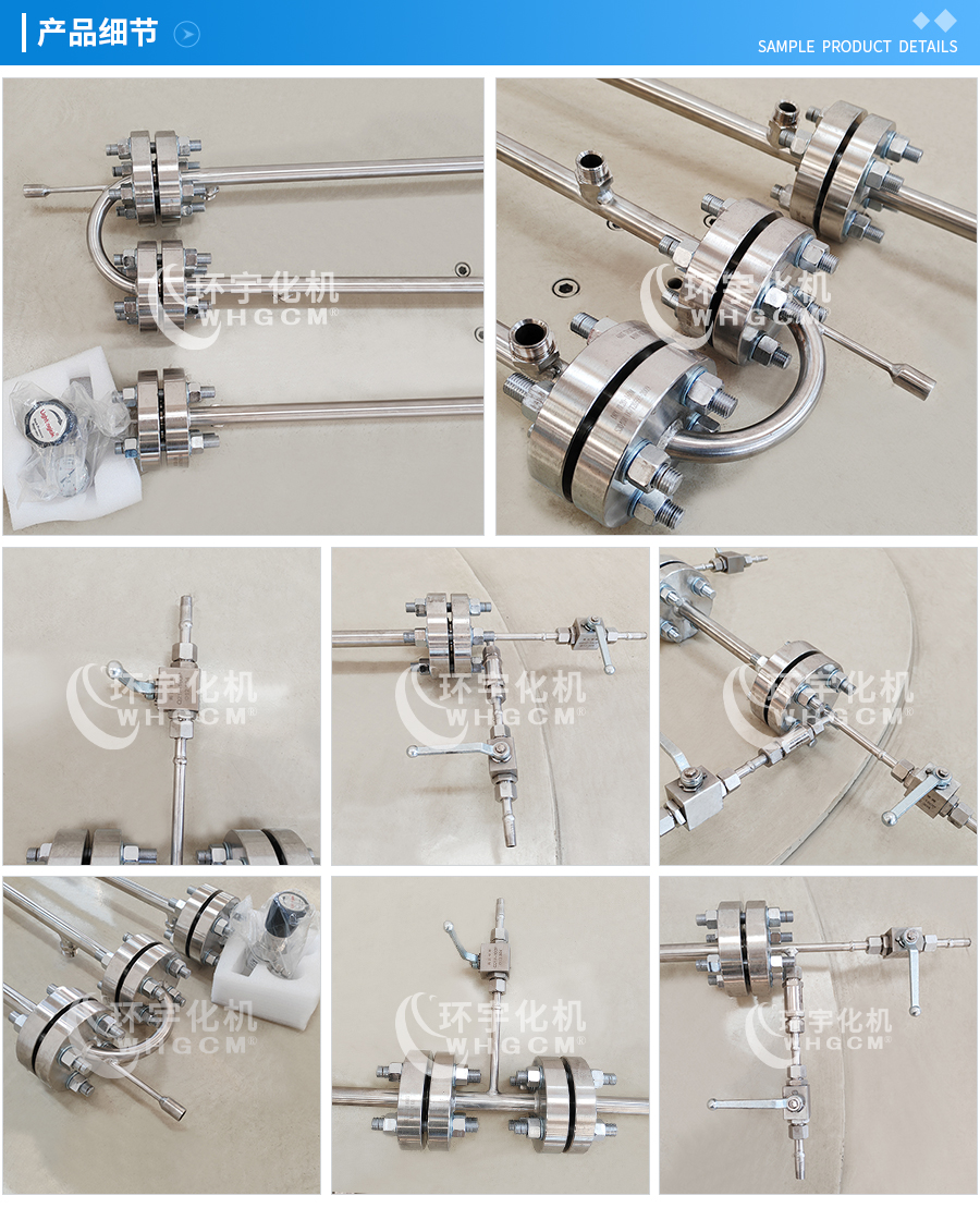 常規(guī)釜蓋開(kāi)口 氣相口配針形閥,液相口配針形閥及釜內(nèi)插底管,固體加料口配絲堵,測(cè)控溫口配鉑電阻,壓力表安全爆破口配壓力表及安全防爆裝置,釜內(nèi)冷卻盤管進(jìn)、出口配水咀
